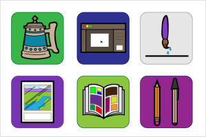 I scanned my draft into my computer and brought them into Illustrator as a template layer. Once I had done that, I reviewed each category and selected what I thought would make an excellent initial digital draft of my set of icons. For ceramics, I went with a stein; graphic design, an Adobe program user interface; watercolor, a wet brush over a piece of paper; photography, a Polaroid; a comic book for comics; and a pen and pencil for my more miscellaneous category (sketching, doodle, etc.). I needed a few elements, however, to translate into each icon that would help tie them together as a whole. Deciding to mimic my sketches a little, I made a thick, bolded outside edge to each graphic. I then put each graphic image inside a rounded corner square, similar to how it might appear on that artist’s webpage. I didn’t really have a set color scheme that I wanted to keep for each one, but for the background colors, I wanted to keep them either one of the following: blue, green, or purple. The hues intentionally vary because I wanted to express how an artist is not limited to just one media, but is open to express themselves in any media, just as there are so many varying media used in the artist’s gallery.