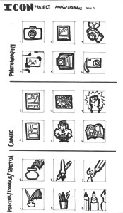 Just like last time, I want to show you more of my design process, but this time, instead of designing a magazine article spread, I needed to make some icons. The project had some pretty clear cut parameters that I needed to follow. The project was to create 4-6 icons, using Adobe Illustrator, that all tied together. After doing some head scratching, I decided that I was going to do a set of icons for an artist’s online gallery. Each icon was going to be a different art medium, that if clicked on by the viewer, they would be directed to a section of the online gallery that featured that particular type of art. As you can probably see, on my parameters list, once I got that idea, different art media just kept coming to me. So much so, that I needed to go through my list and really think about what I could do by the deadline, and would meet the requirements.