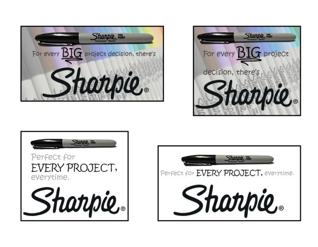 After scrapping my original design in part, and all of the reworking, I finally finished an ad for Sharpie Permanent Markers that meets the more whimsical demand from the product testing. This was a challenge from the moment I got the type of ads I was to make; I normally work at a much larger image sizes for most of my projects, and to suddenly make much smaller designs, made this whole experience one of the best projects that I have ever done. I tried so many new tools, creative thinking processes, and am so happy that I was able to make a product that I am very proud of. It is not often that I get this kind of growing experience, and I am glad I was able to have it!