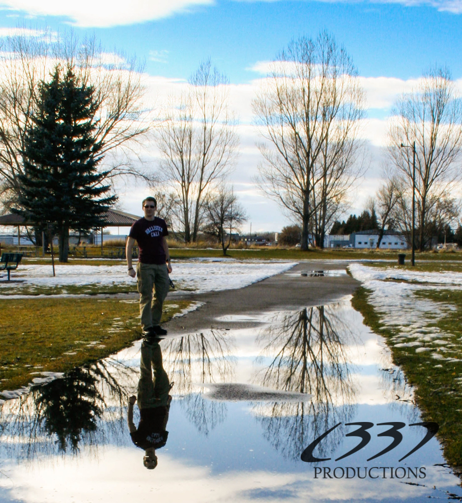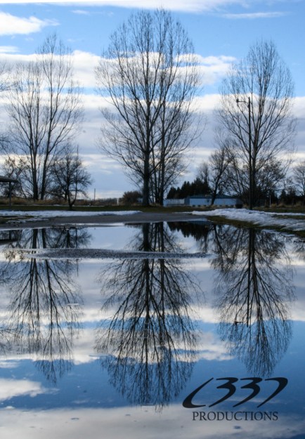 This week I went out with the intention of capturing something on film from a lot of different angles. As many as possible. When I was planning on where I was going to go, and what I was going to photograph, I remembered a little park my wife and I had walked along during the summer. I remember looking across the lake there on that warm summer day and seeing a beautiful mirror image of the trees and bushes reflecting brilliantly. I wanted to see if I could capture that same brilliance that I saw that day. With that intent, I watched for a day when there was going to be a break in the constant winter gray overcast sky to make the shoot possible. I got lucky, and yesterday was the first day that I was able to get out and do it. I left my home and began to walk towards the park, but I never made it to the spot I had planned on going. Before one can walk into the park, there is a common area with a playground, tennis courts, pavilions, etc. This year, we have had a really warm winter, so most of the snow has melted, and all over this common area were the perfect, lake like puddles. In fact, these puddles were so fantastically large, that they reminded me of that summer day so much that I just couldn’t pass up the opportunity to shoot right there. And so I did!