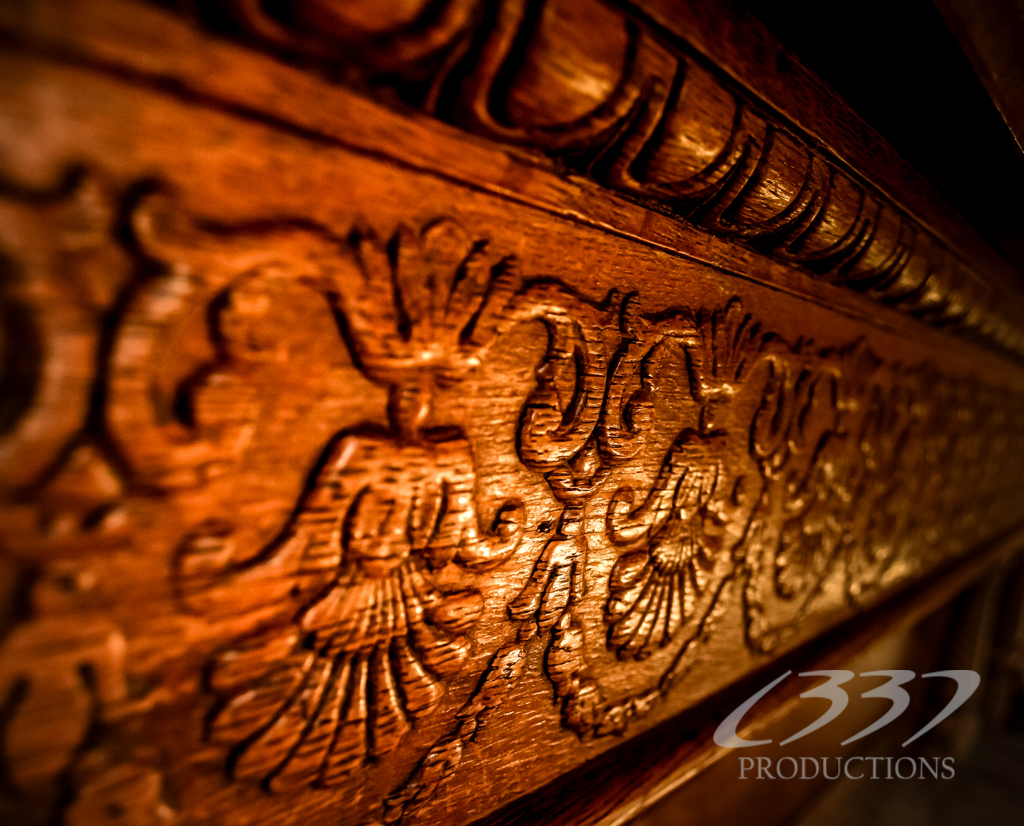When I first arrived, the first place I visited was the saloon. I didn’t want to carry around all of my equipment and props that I had brought for the entire day, so I dropped my gear behind the bar, and began to explore the one room. I took a few test shots, and got close up to a lot of the different objects in the room. I took a lot of different and odd angle shots, and this was one of the them. Running along the top of the bar was this beautifully carved design. I got up close, set my camera up on a tripod, and got in as close as I could, and snap! A beautiful image! I brought it into Adobe Lightroom and adjusted the cropping and fixed the rotation to make it level.