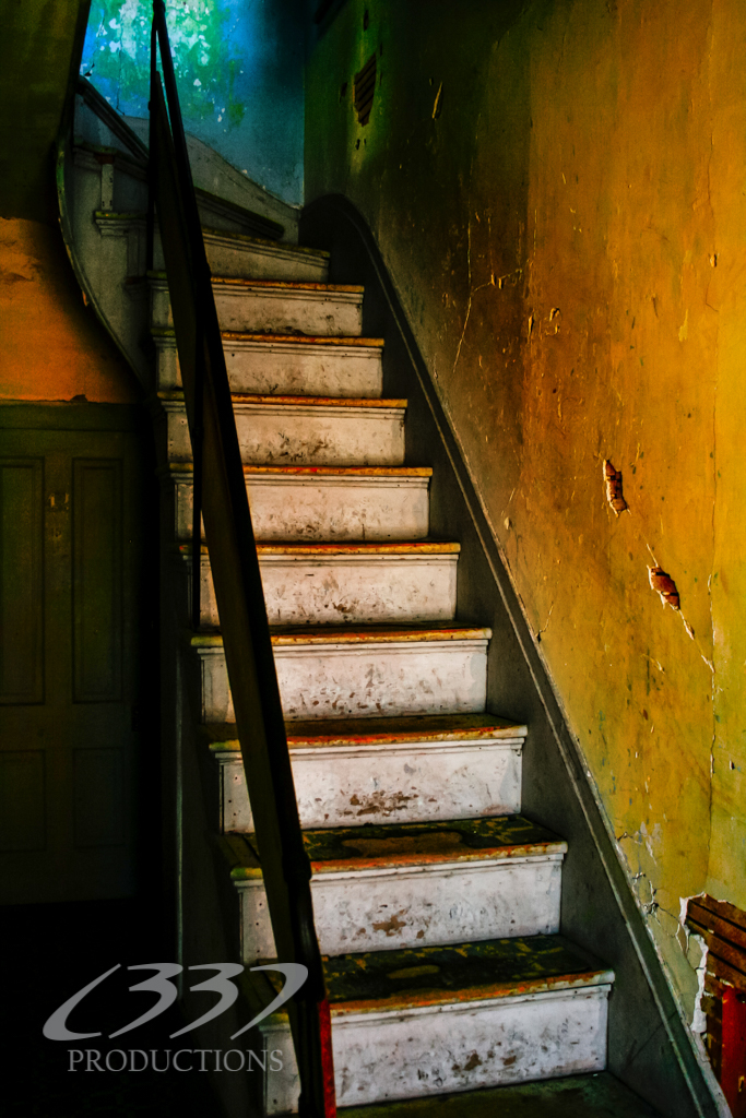 After I left the saloon, I went across the street and entered the building directly in line with the saloon. When you first enter the building, you are greeted by this stairway in the entry room. This house was a good example of having had many different tenants over the hundred year history of the town, because there were so many different layers of wallpaper on top of each other, vinyl flooring, as well as peeling paint. But this stairway was a masterpiece all by itself. To explain why I found this stairway a masterpiece was that you could see the change in paint on the walls, and the way it transitioned from the yellows at the bottom, to the beautiful blue at the top. Standing there at the bottom of the stairs looking up, it gave me the impression that I was looking at the very stairs that could take me up into space. The blue patch looked like a little blue galaxy, inviting me to just go up. I took another set of bracketed shots of it, and combined it once more in Adobe Bridge, determined to try and master the blending. And I think I did a much better job doing so. That Blue Galaxy just popped, just as it did when I was there in person.