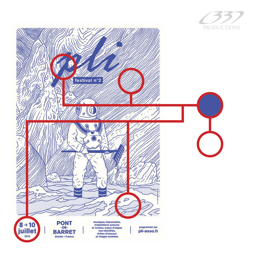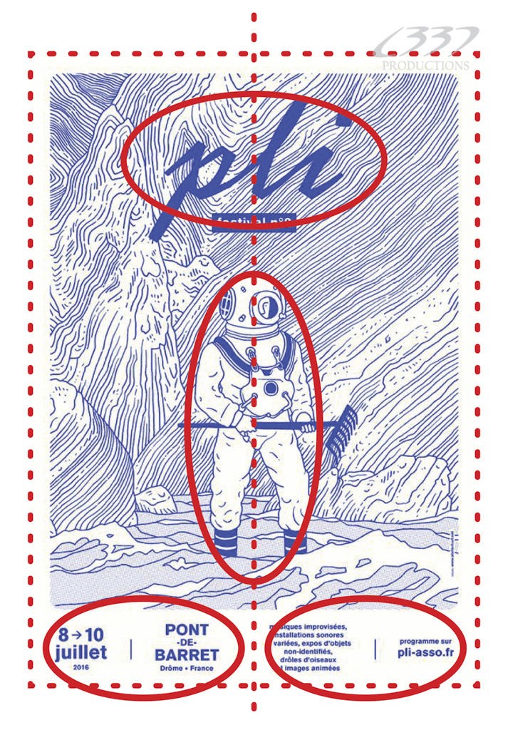 What always seems to be the design aesthetic that always seems to catch my attention is the symmetrical balance. I outlined in red dashes the compositions boundaries and the mirrored axis. I circled the elements that centered along that axis point; the name of the event at the top, the deep see diver, and the text at the bottom.